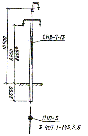 Опора промежуточная П 10-5 закрепляется в котловане на глубину от 2 до 2,5 метров. Опоры применяются совместно с анкерными плитами. Стойку опоры устанавливают не вертикально, а с наклоном на 10-20 см в сторону, противоположную воздействию усилий от натяжения проводов.