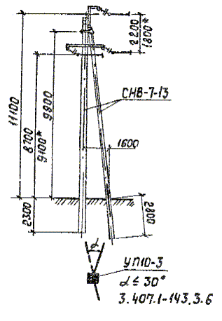 Опора промежуточная УП 10-3 закрепляется в котловане на глубину от 2 до 2,5 метров. Опоры применяются совместно с анкерными плитами. Стойку опоры устанавливают не вертикально, а с наклоном на 10-20 см в сторону, противоположную воздействию усилий от натяжения проводов.